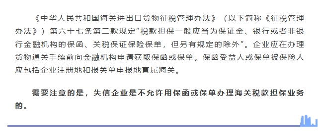《征税管理办法》第六十六条第一款规定“有下列情形之一的,纳税人、扣缴义务人要求海关提前放行货物的,应当按照初步确定的应纳税额向海关提供足额税款担保: (一)进出口货物的计税价格、商品归类、原产地等尚未确定; (二)与确定货物应纳税额有关的报关单证尚未提供; (三)货物已被采取临时反倾销措施、临时反补贴措施; (四)适用报复性关税、对等关税措施等情况尚未确定; (五)符合办理减免税货物税款担保条件; (六)正在办理延期缴纳税款手续; (七)办理汇总征税业务; (八)因残损、品质不良或者规格不符,纳税人、扣缴义务人申报进口或者出口无代价抵偿货物时,原进口货物尚未退运出境或者尚未放弃交由海关处理,或者原出口货物尚未退运进境。” 需要注意的是,国家对进出境货物、物品有限制性规定,应当提供许可证件而不能提供的,以及法律、行政法规规定不得担保的其他情形,海关不予办理担保放行。